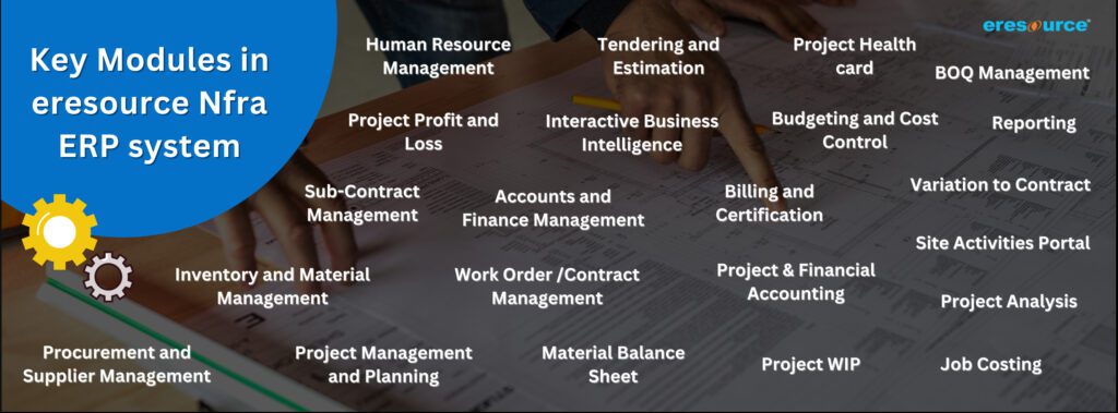 eresource NFRA ERP deals with core functionality such as Tendering and Estimation Management, BOQ Management, Project Planning, Site Activity, Budgeting, Subcontract Management, Billing and Certification, Purchase, Inventory, Accounts and Human Resource Management.
